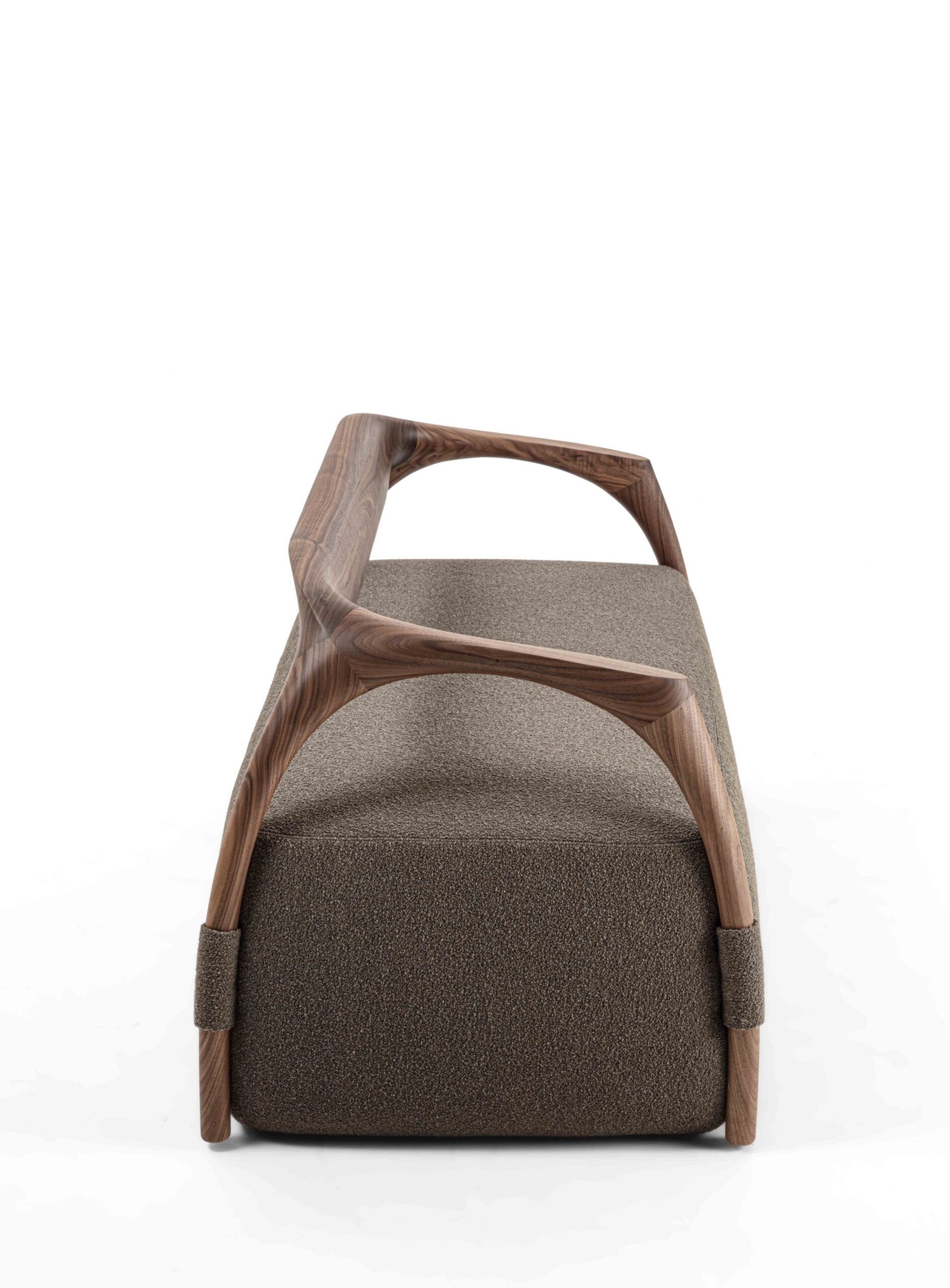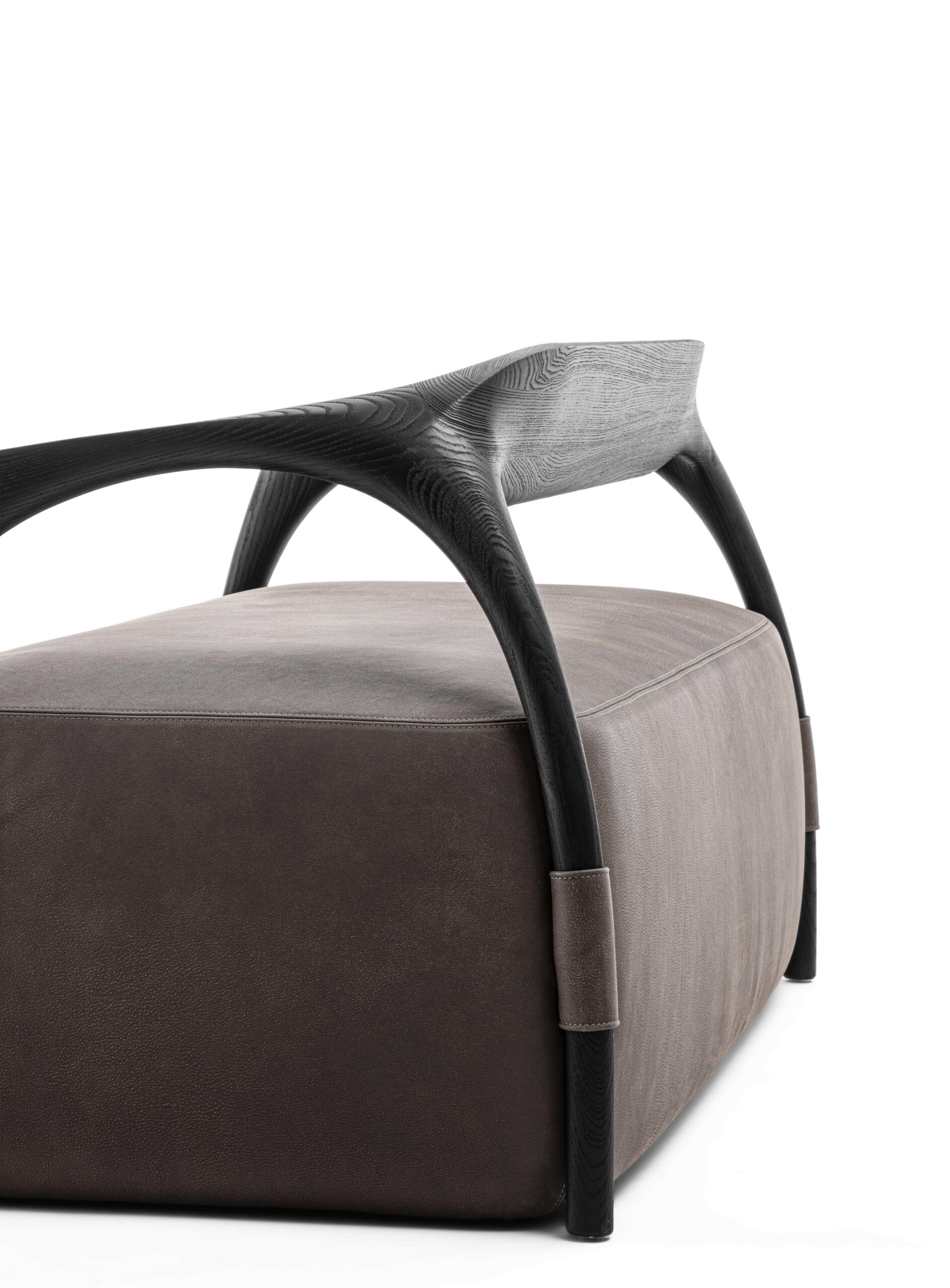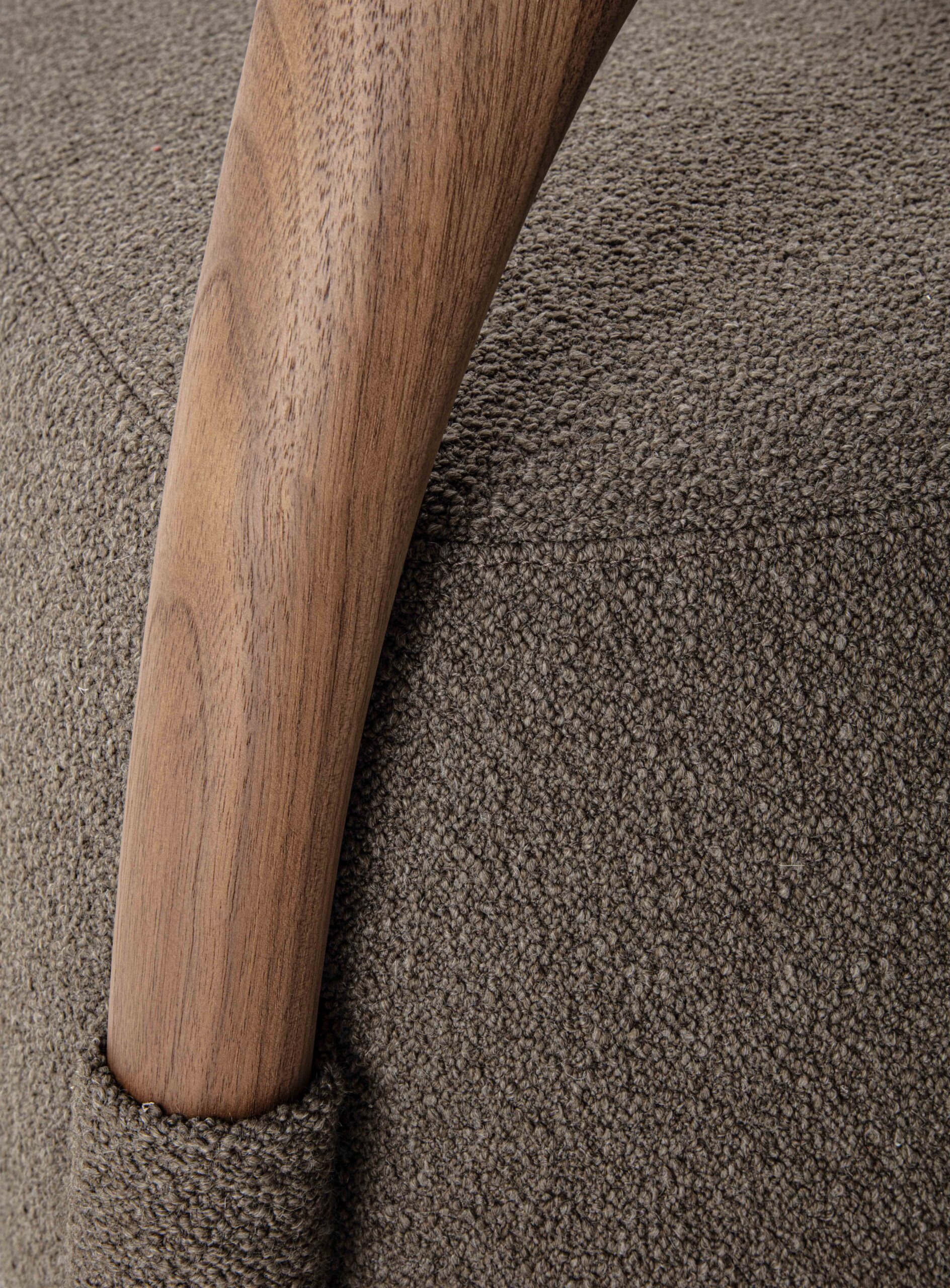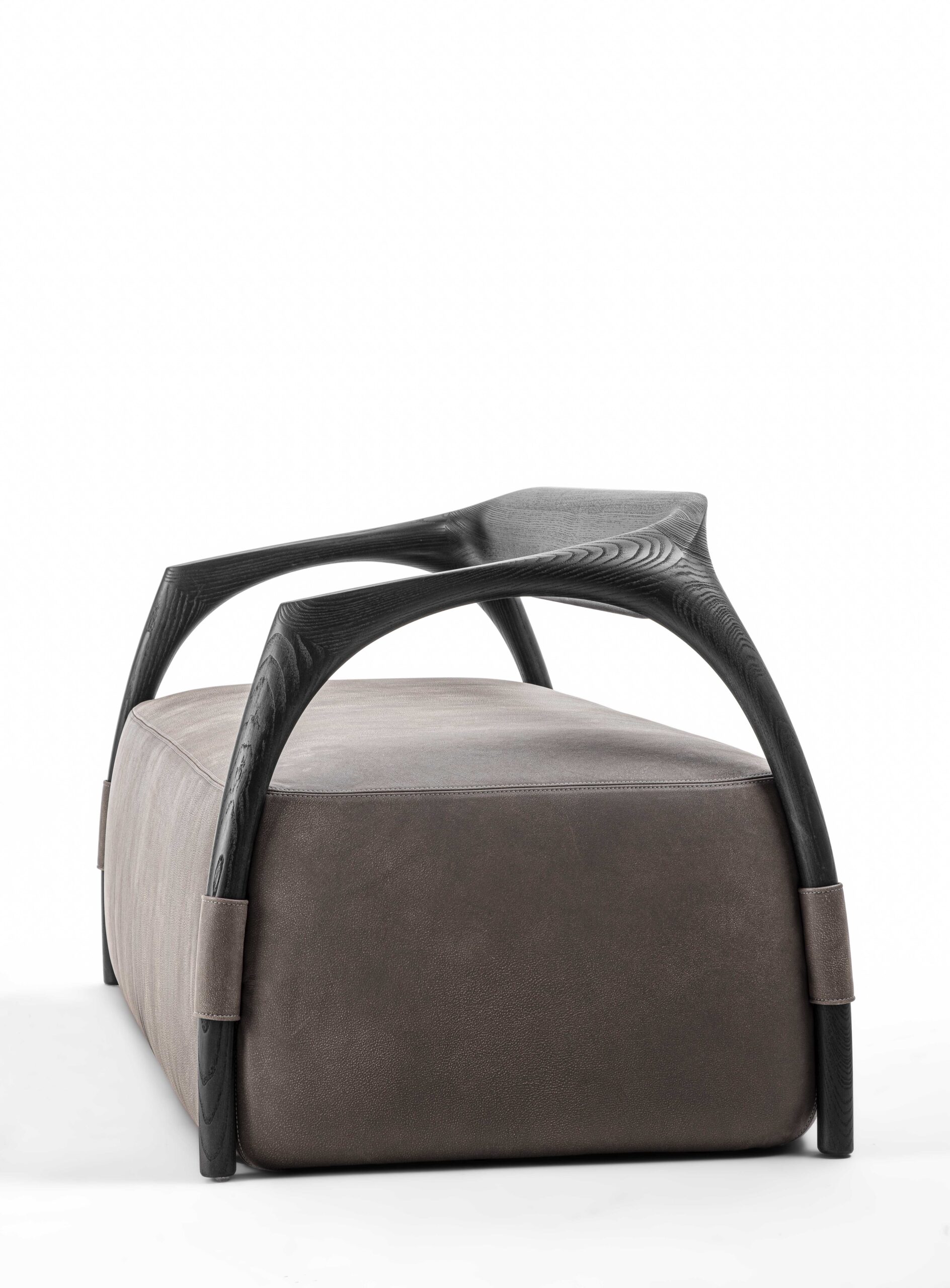沙發結構採用實木製成,由椅腳與靠背構成,座墊為填充設計,可選擇布料或皮革包覆。
