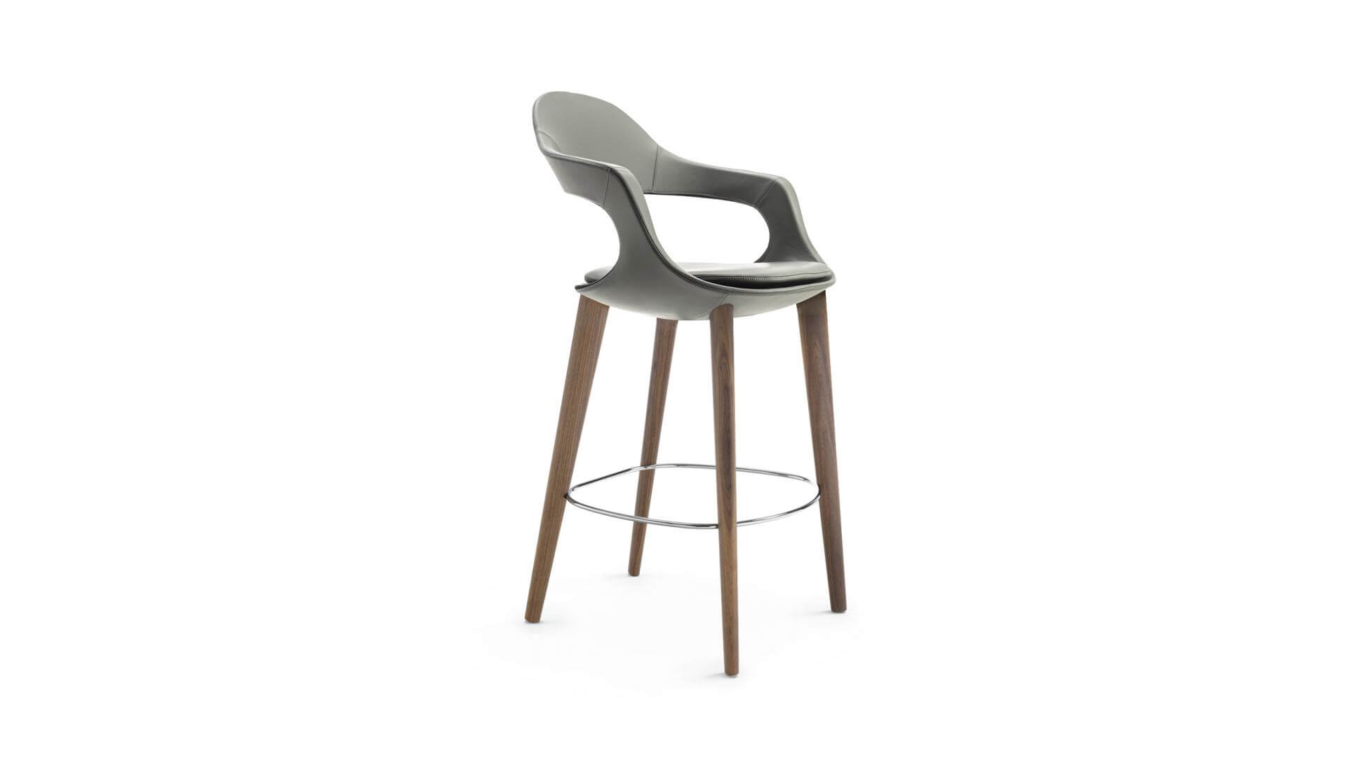 吧台凳,錐形凳腿,可選胡桃木卡納萊託或白蠟木材質。亮鉻色腳踏。高靠背,內置薄型座墊,內部鋼架結構,填充物為高密度聚氨酯,表面覆以不同材質。
