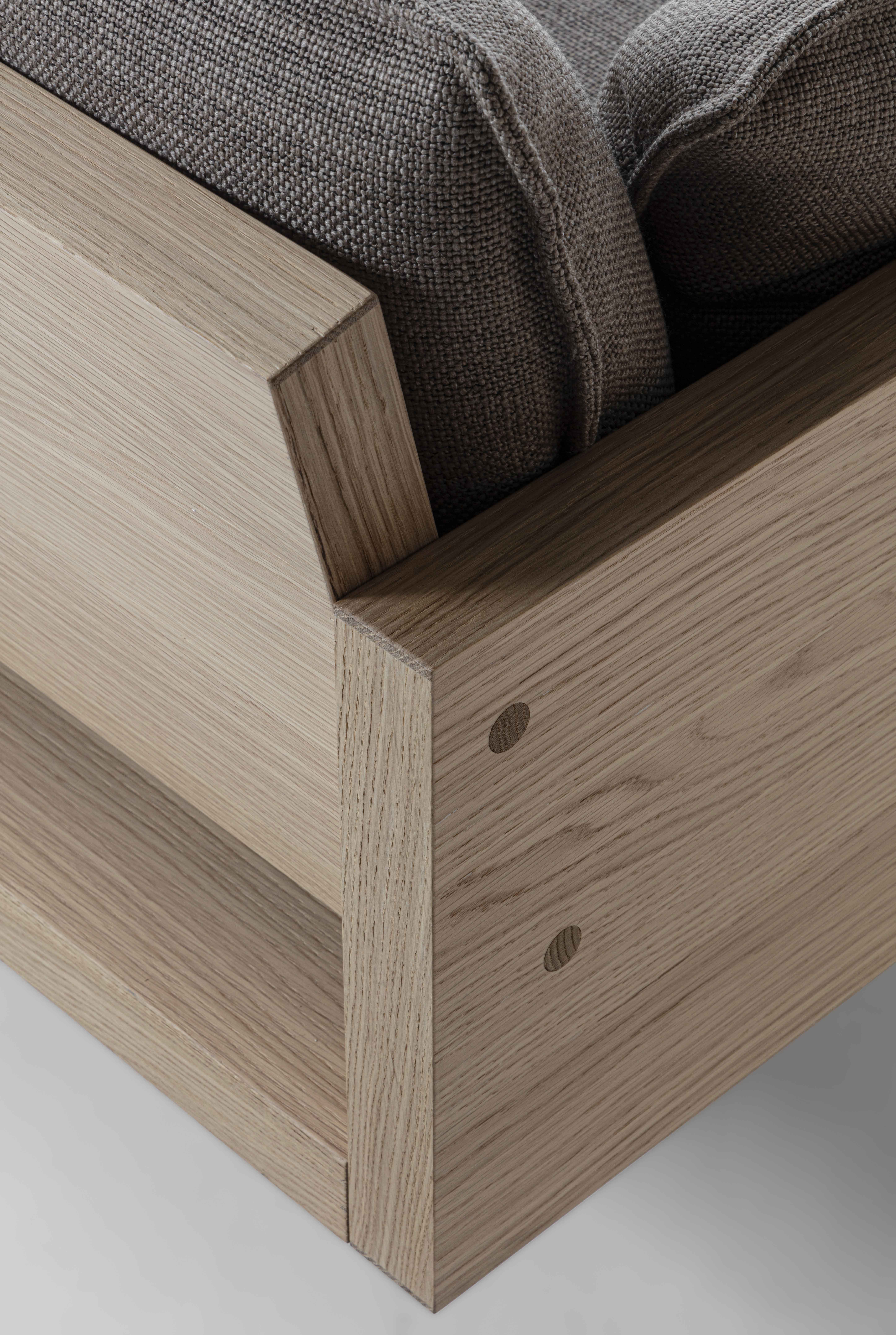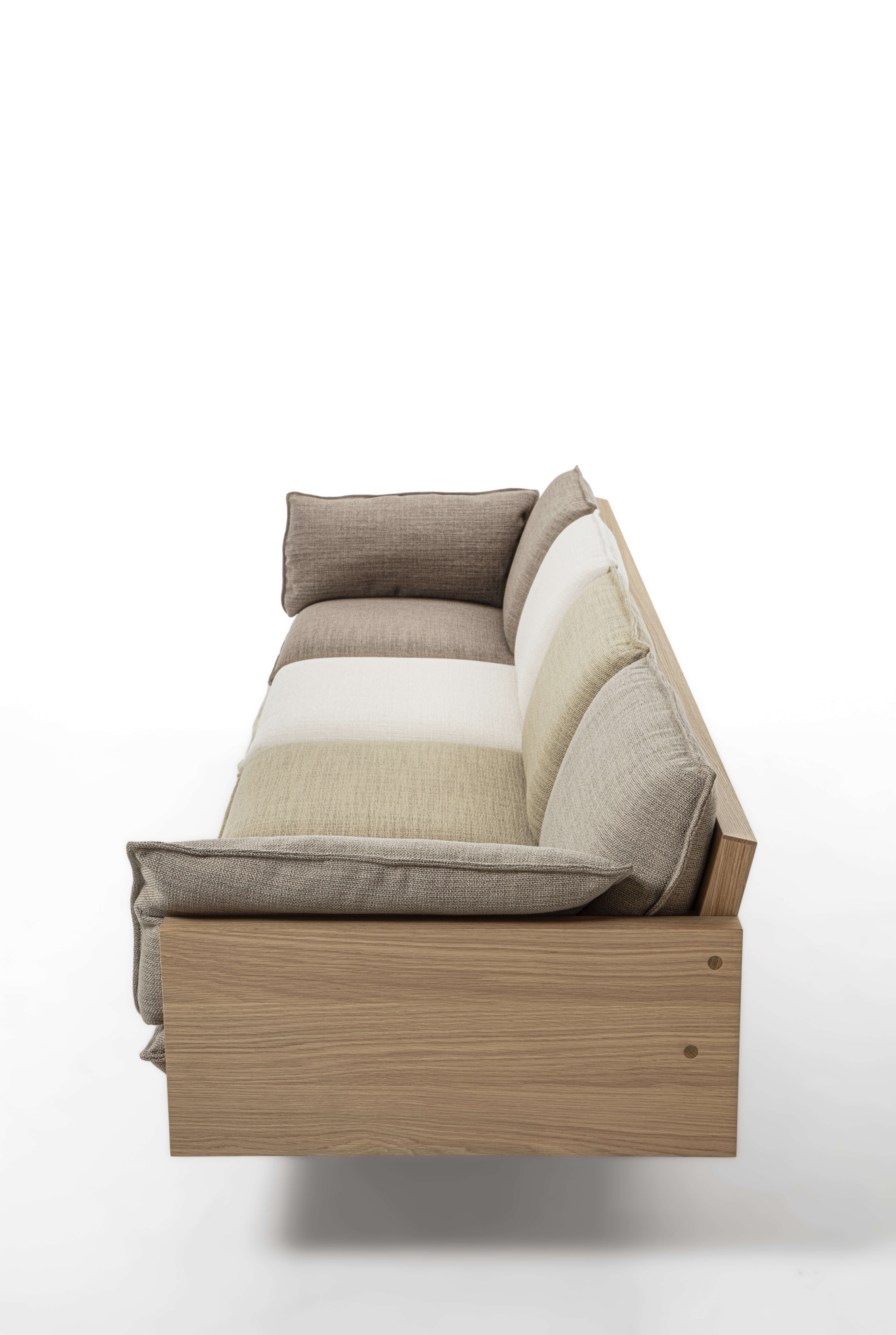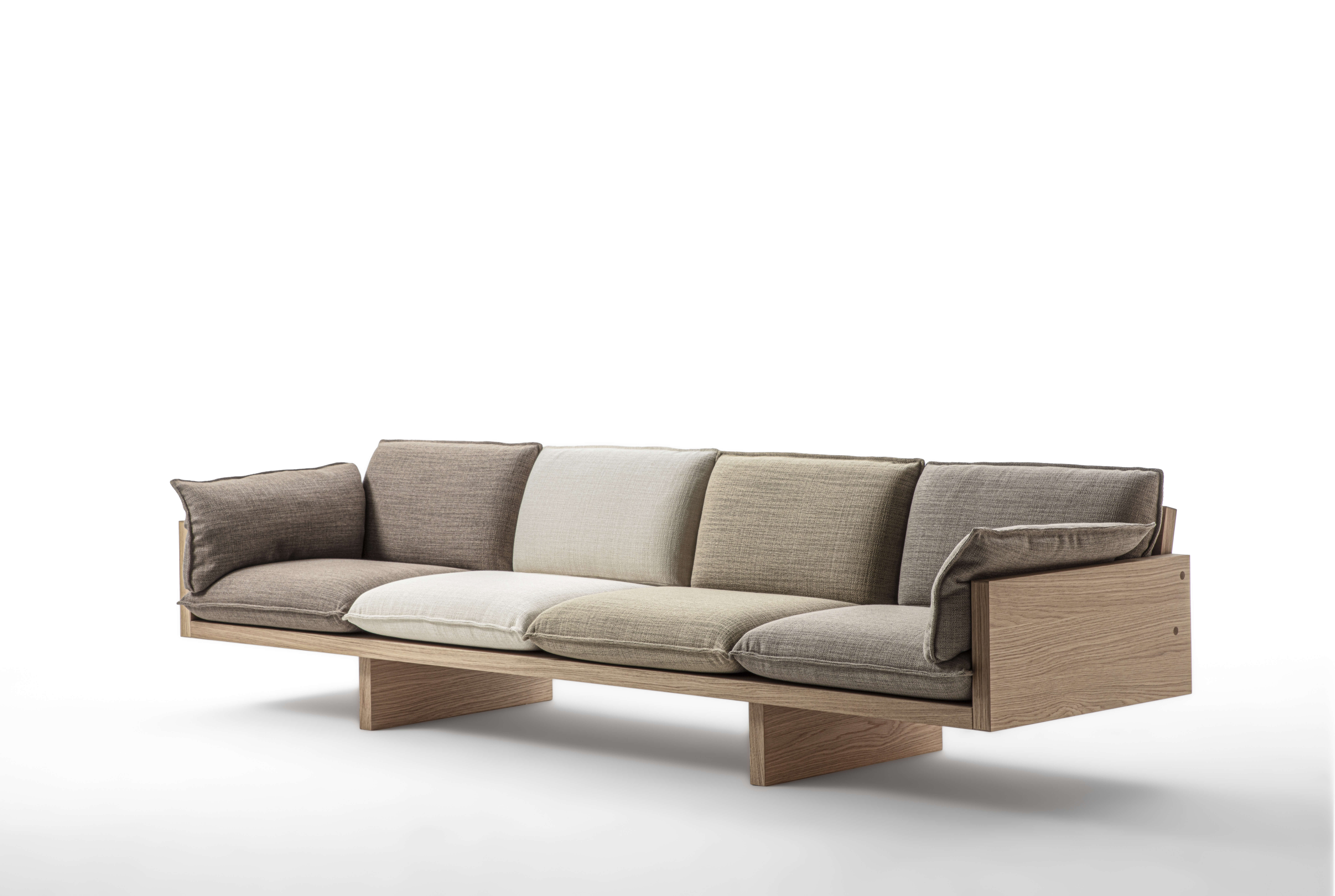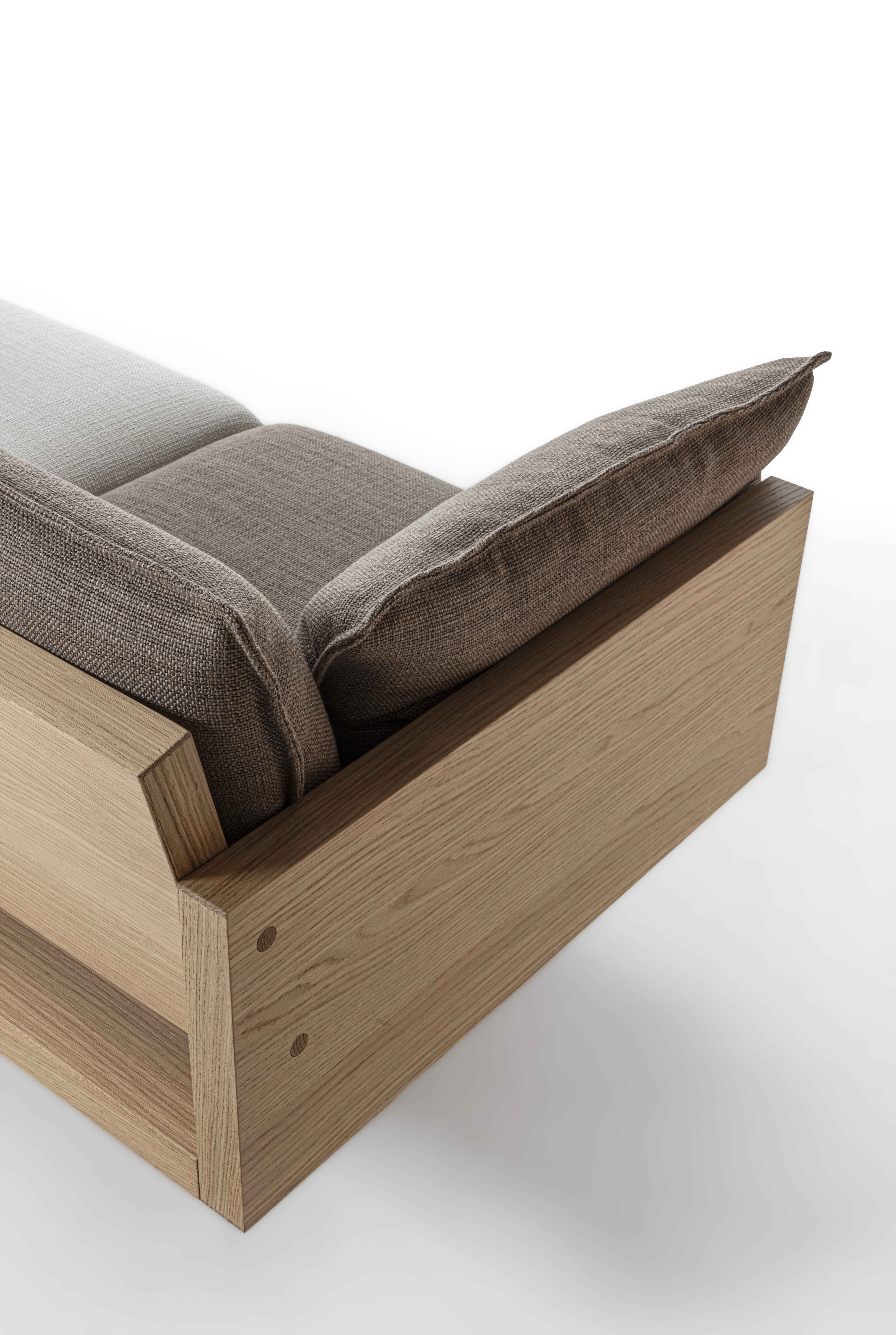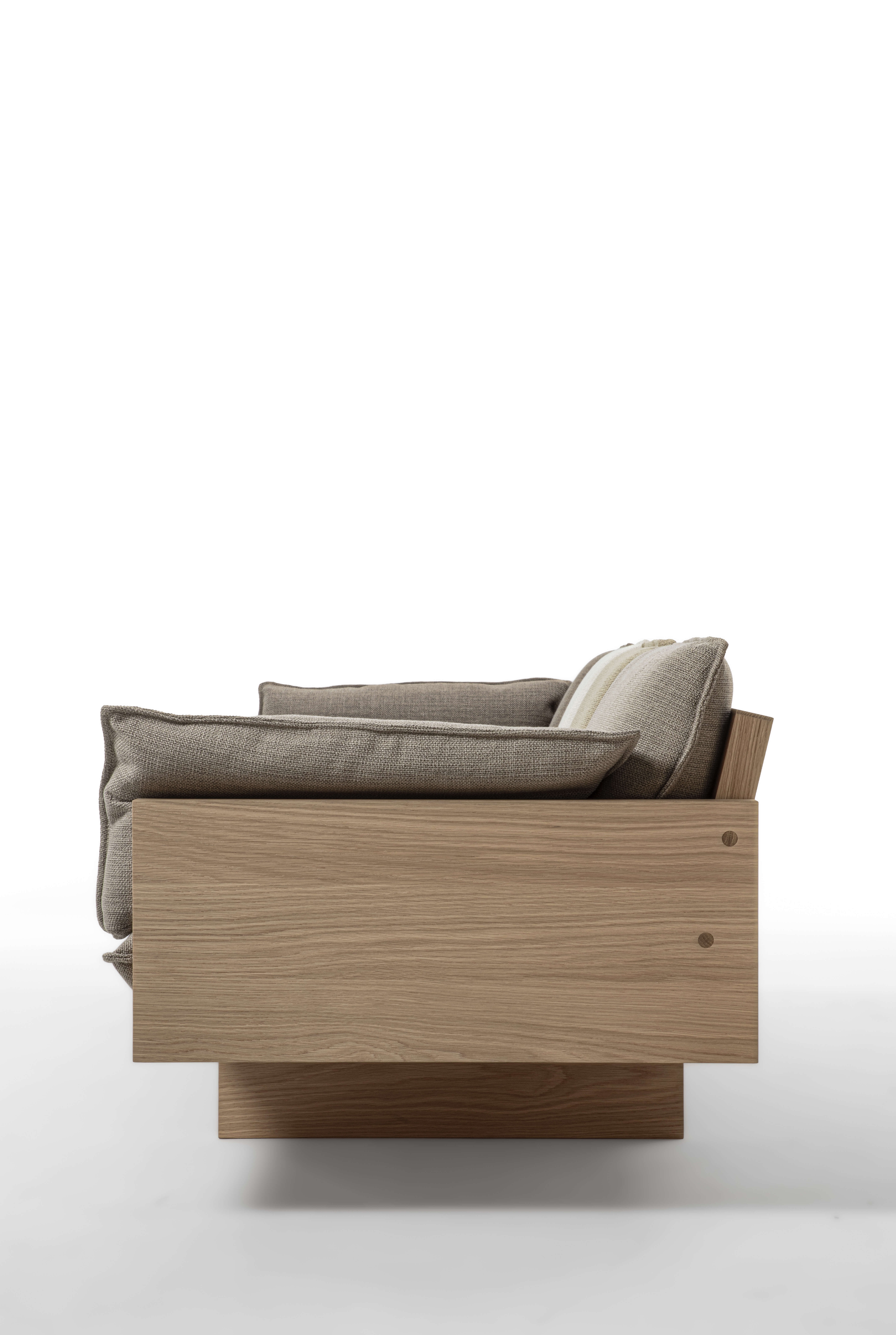 一款採用木質框架,並以織物或皮革軟墊裝飾的沙發,包括座椅、靠背和扶手。