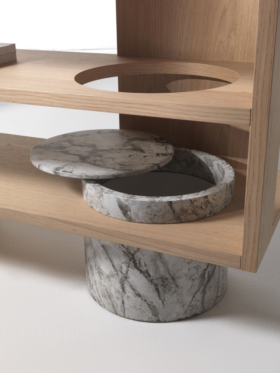 書架由木質框架和層板組成,底座為木質支腳,並配有經過處理的木質花瓶托架或底座。 一個與書架無關的物體從頂部掉落,穿過書架,在層板上砸出洞,最終摔在地上。 這種奇特的碰撞方式創造了一個空間,可以在書架上放置盆栽植物或雕塑,與書籍或其他物品共存。