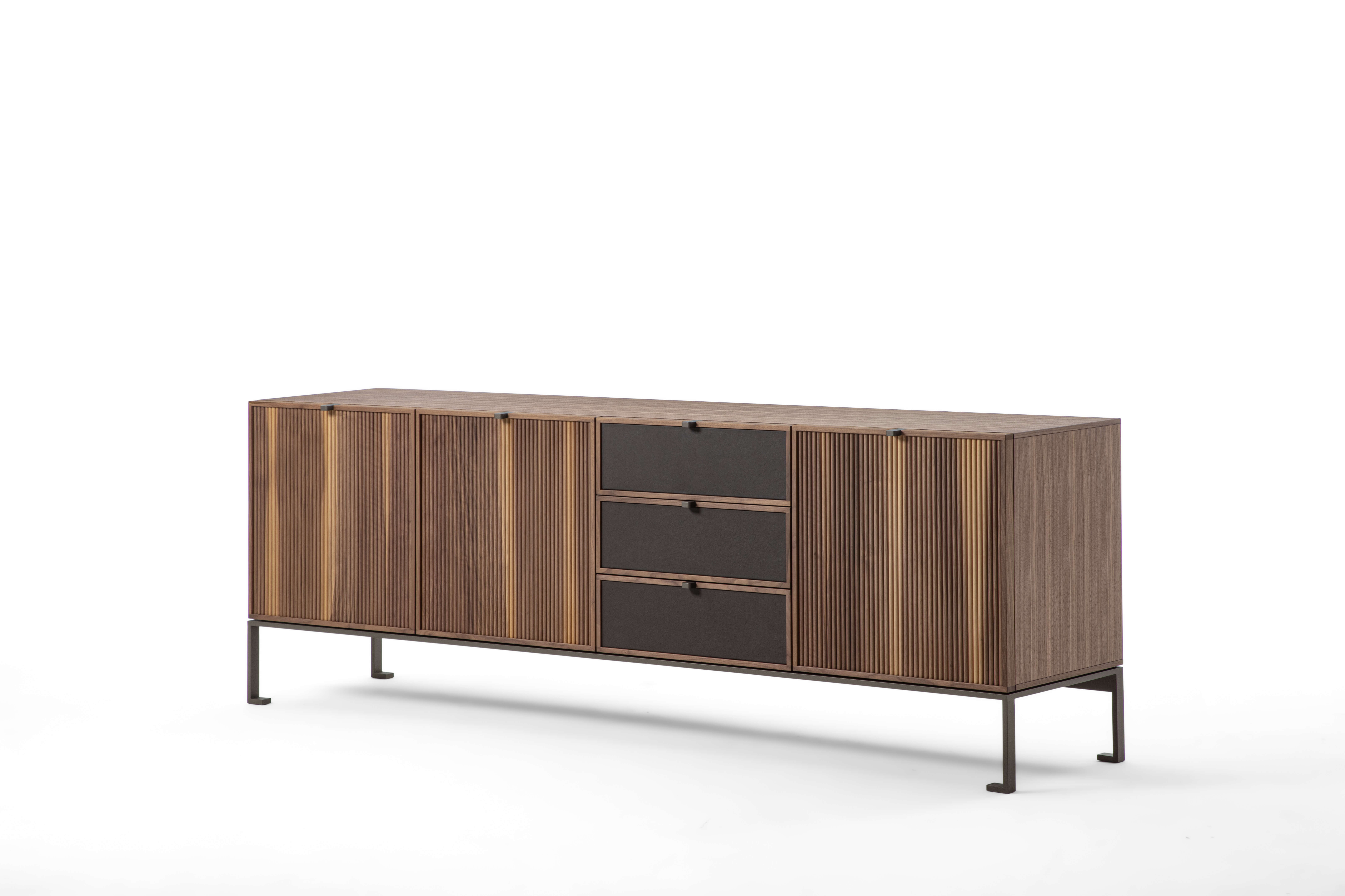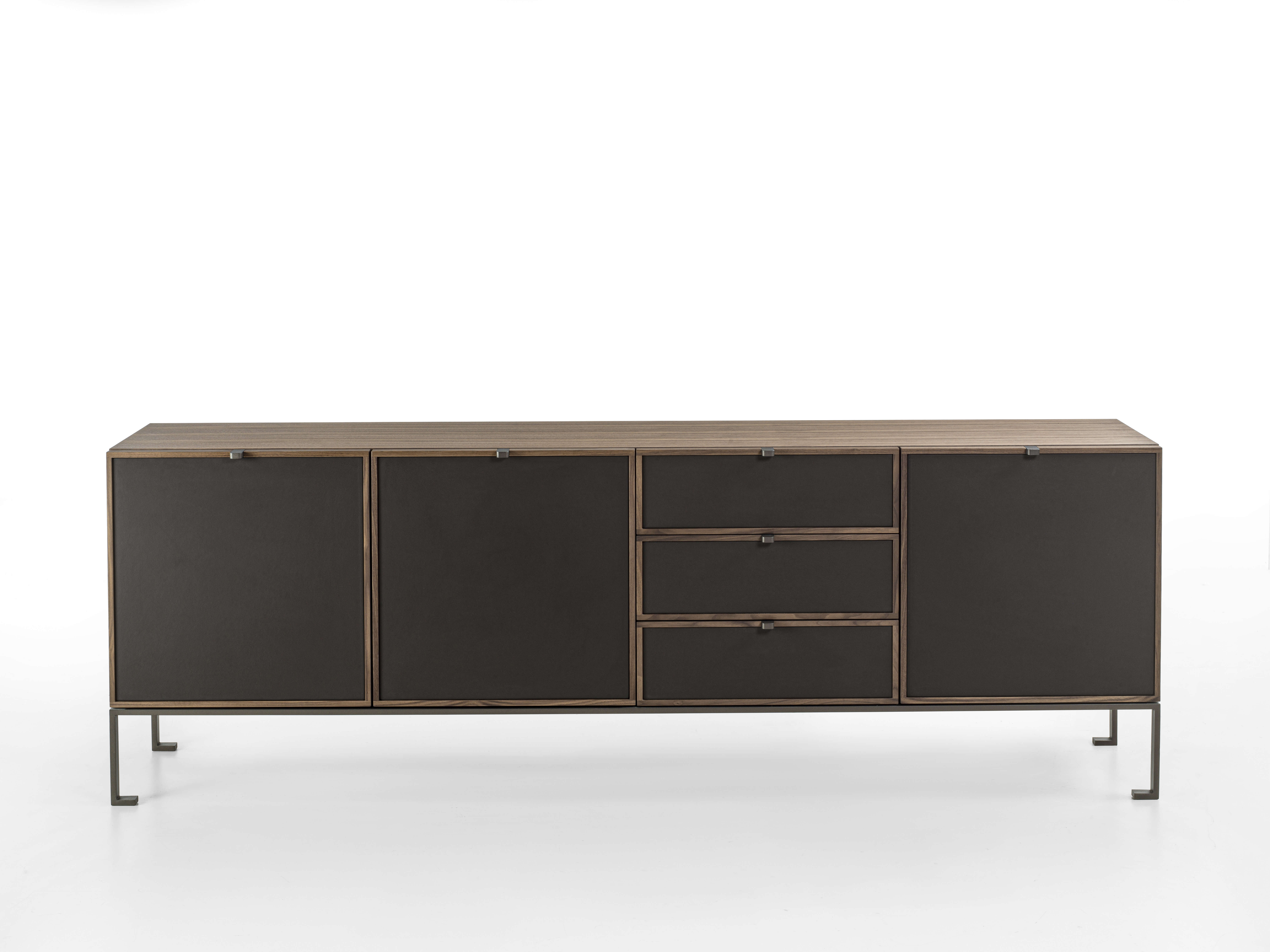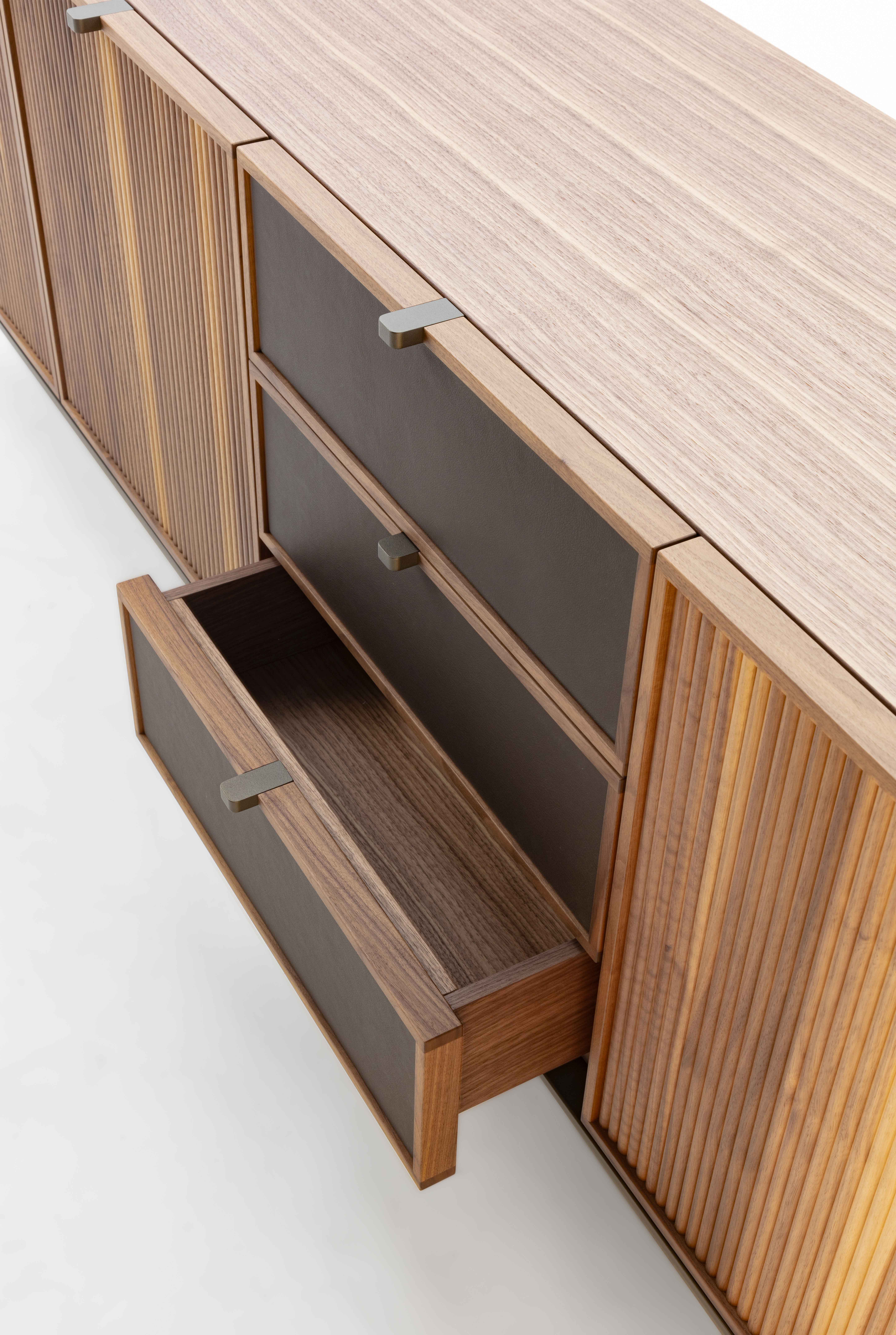 木質置物櫃,金屬底座。檯面可選木質或大理石材質,櫃門和抽屜均有多種款式可選,櫃門飾面可選羅紋或皮革飾面。內部隔板為木質。