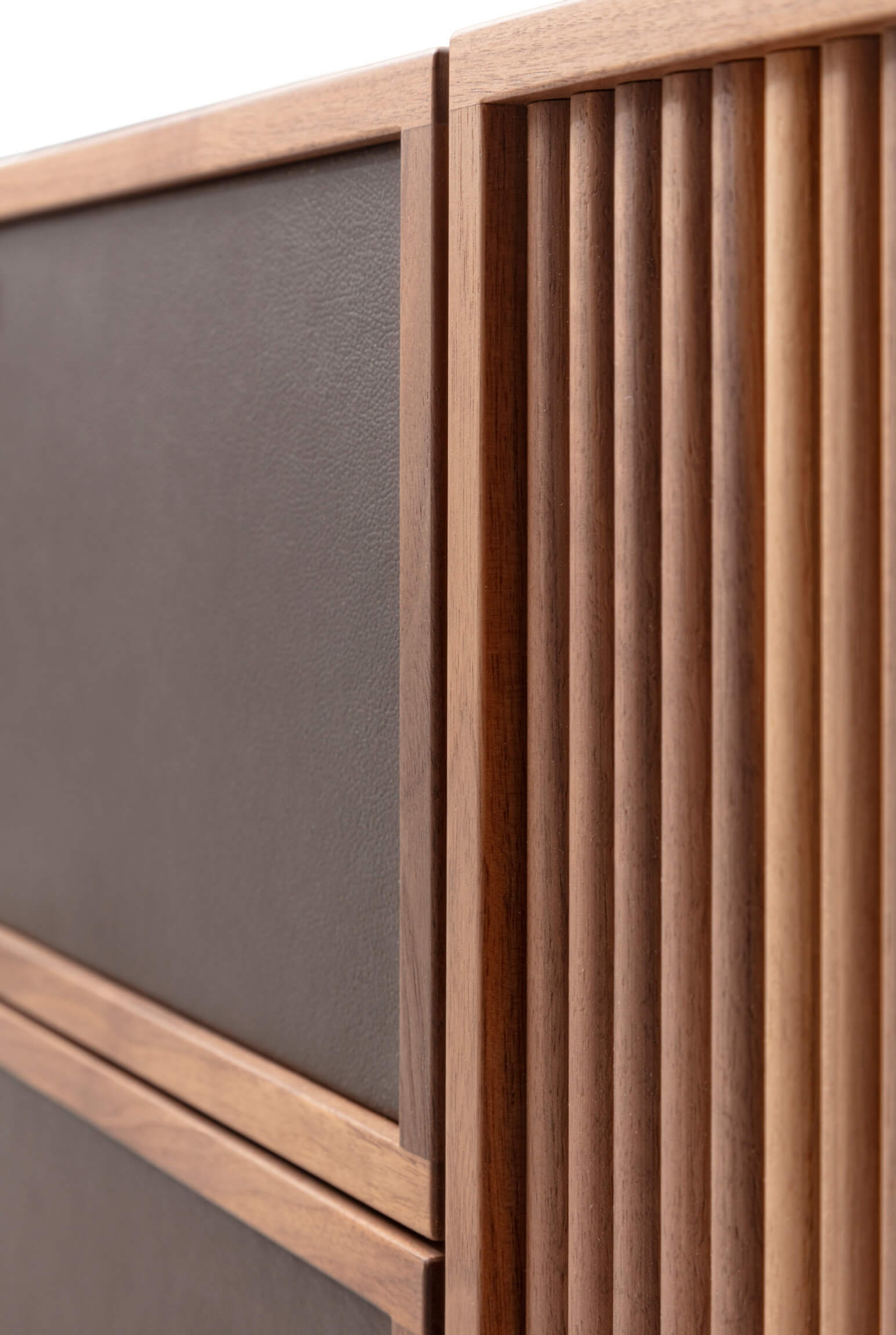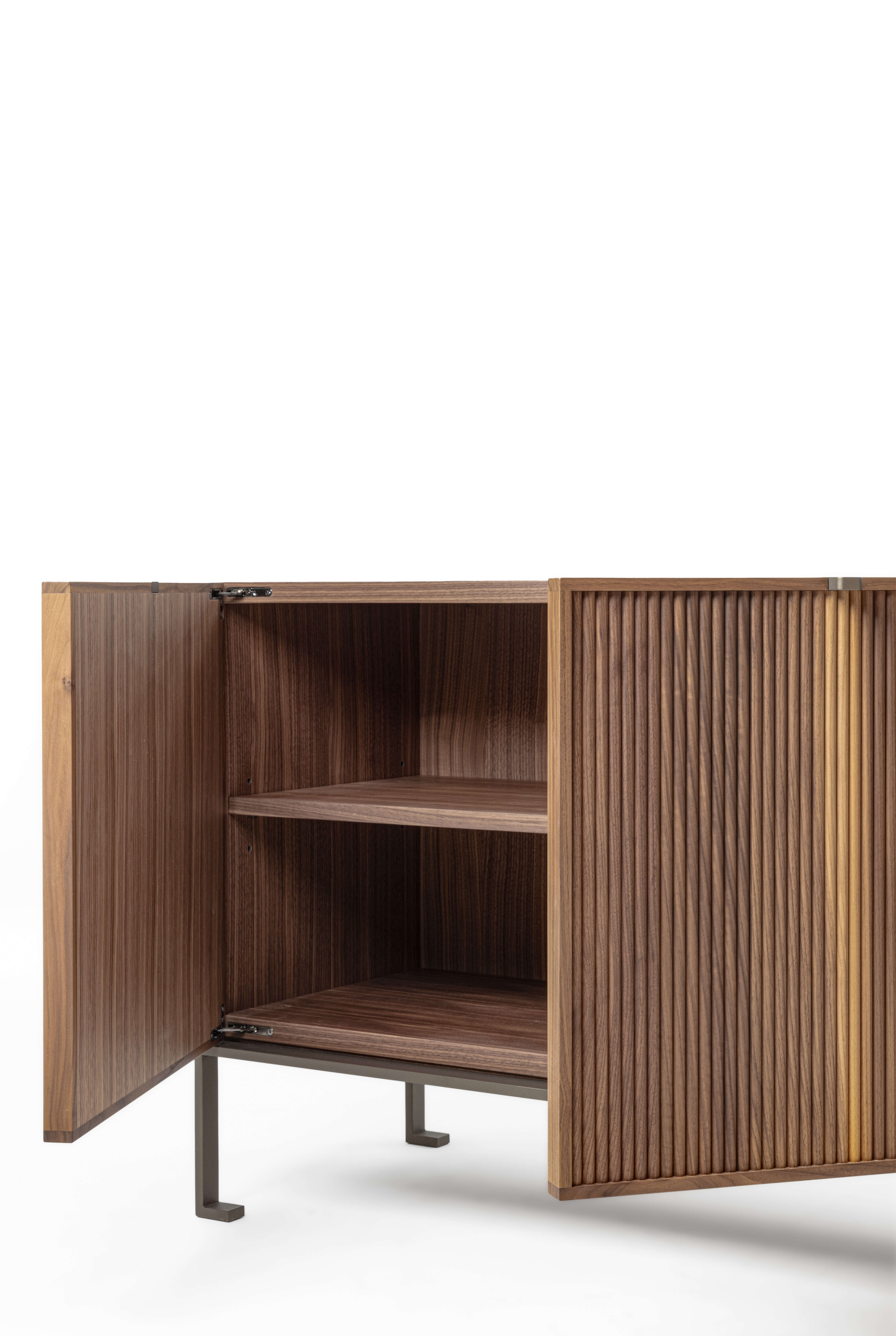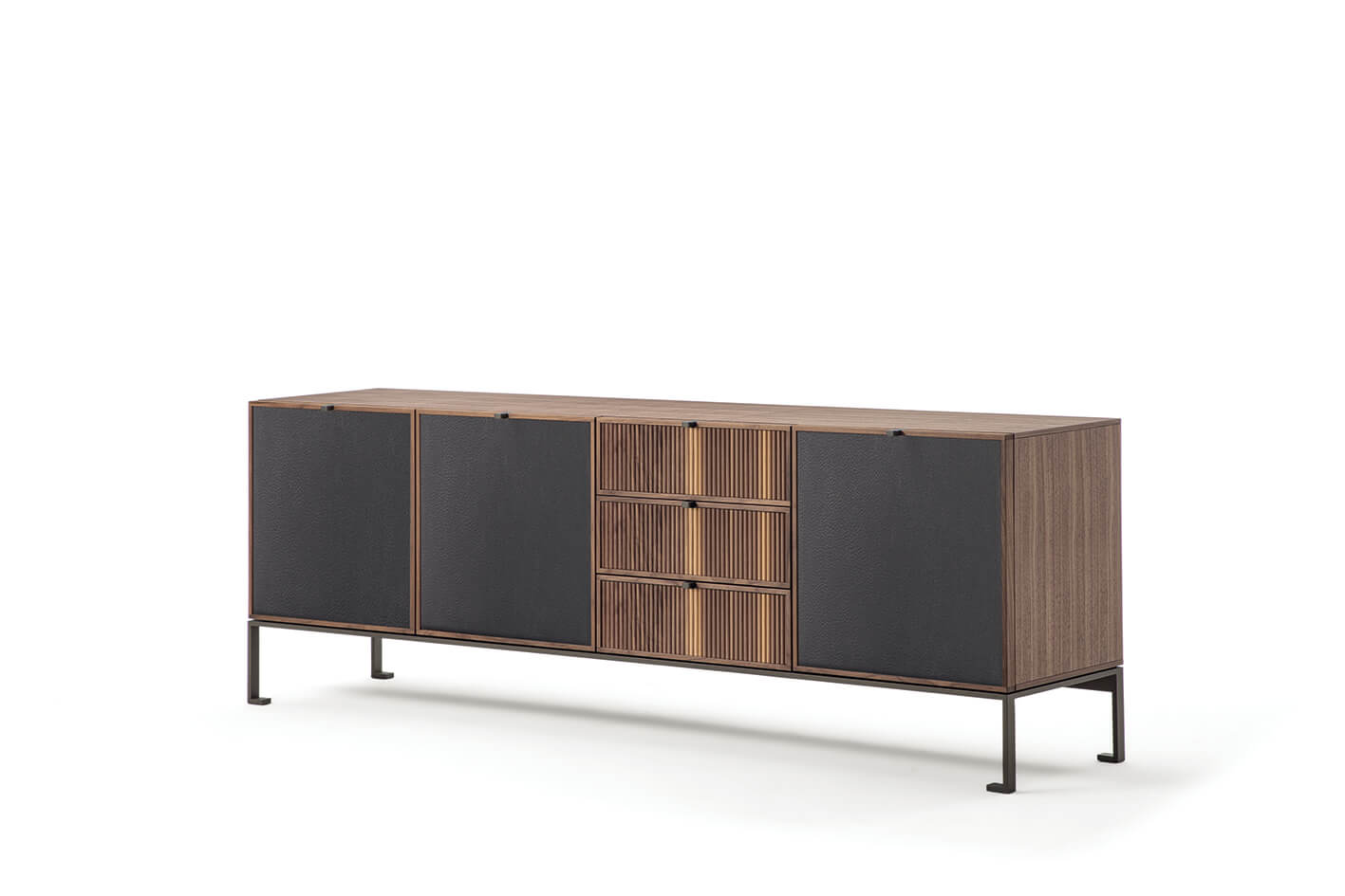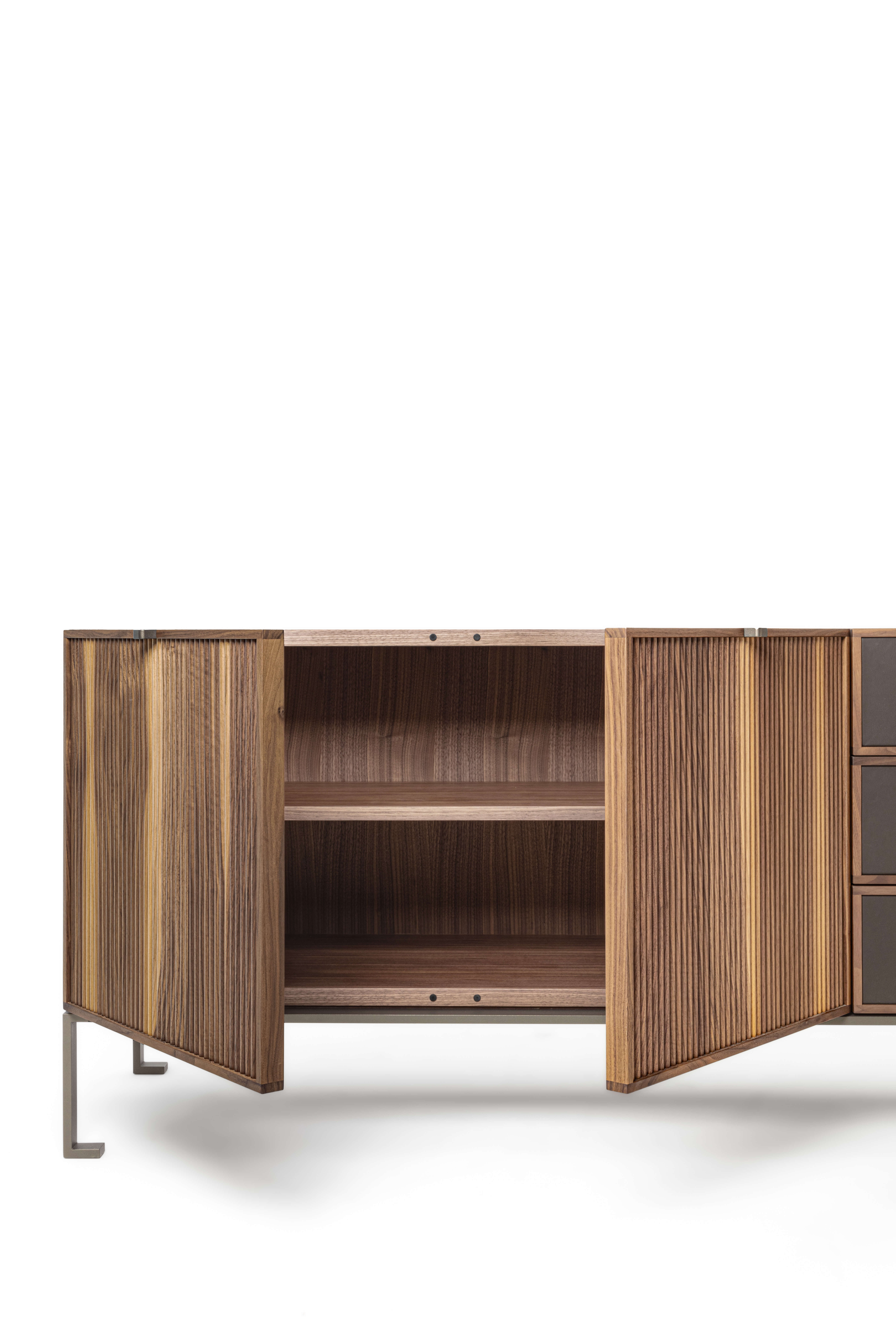 木質置物櫃,金屬底座。檯面可選木質或大理石材質,櫃門和抽屜均有多種款式可選,櫃門飾面可選羅紋或皮革飾面。內部隔板為木質。