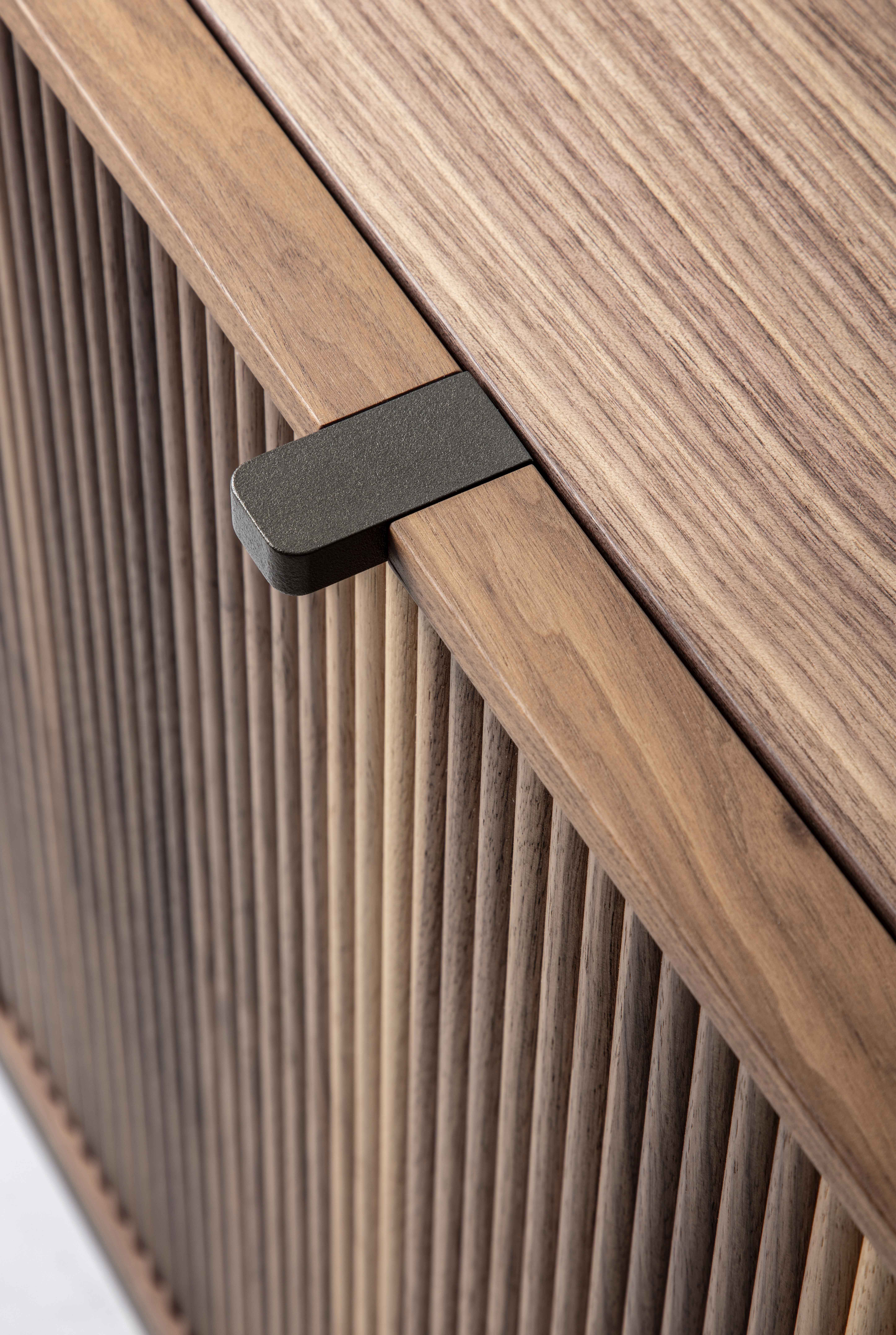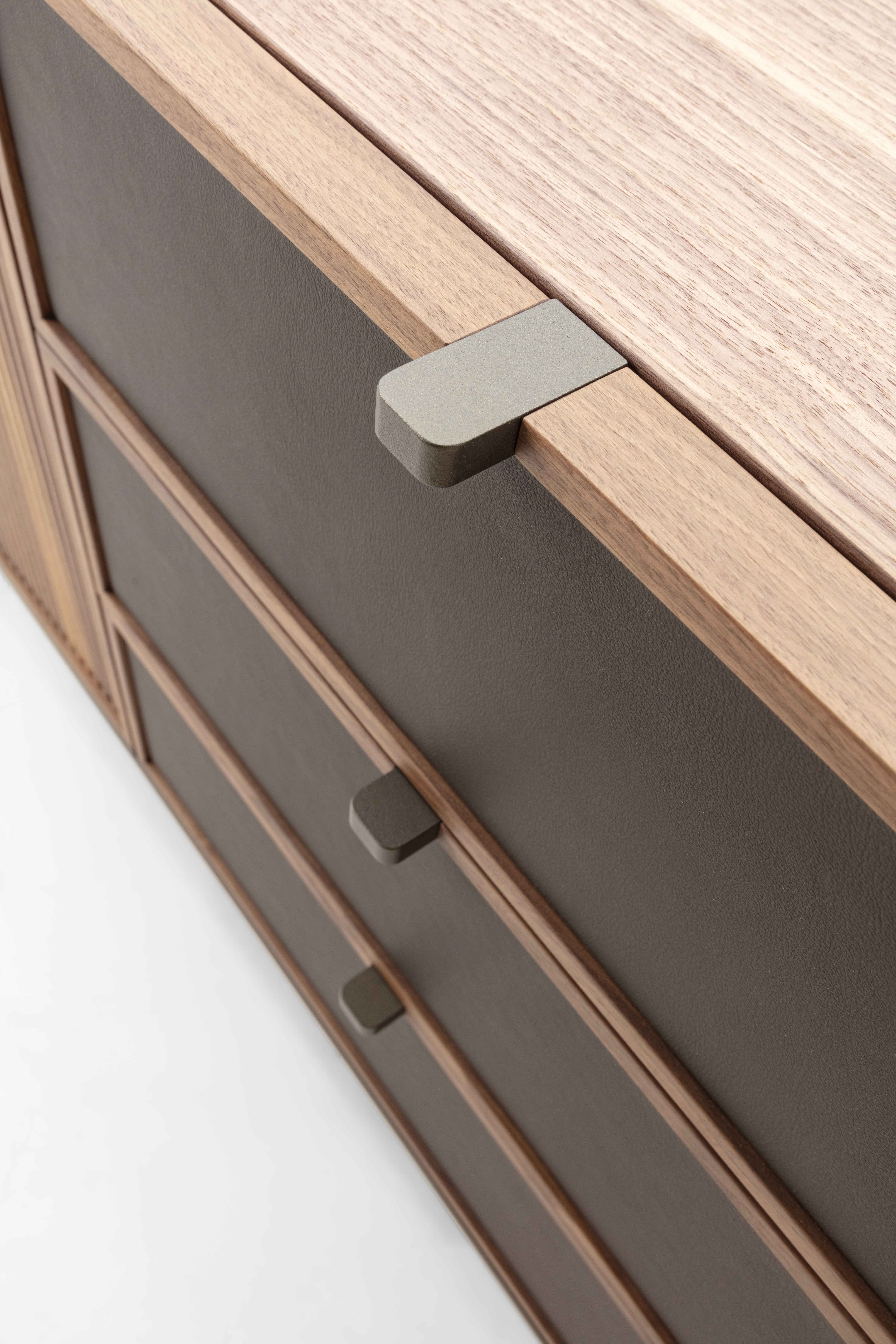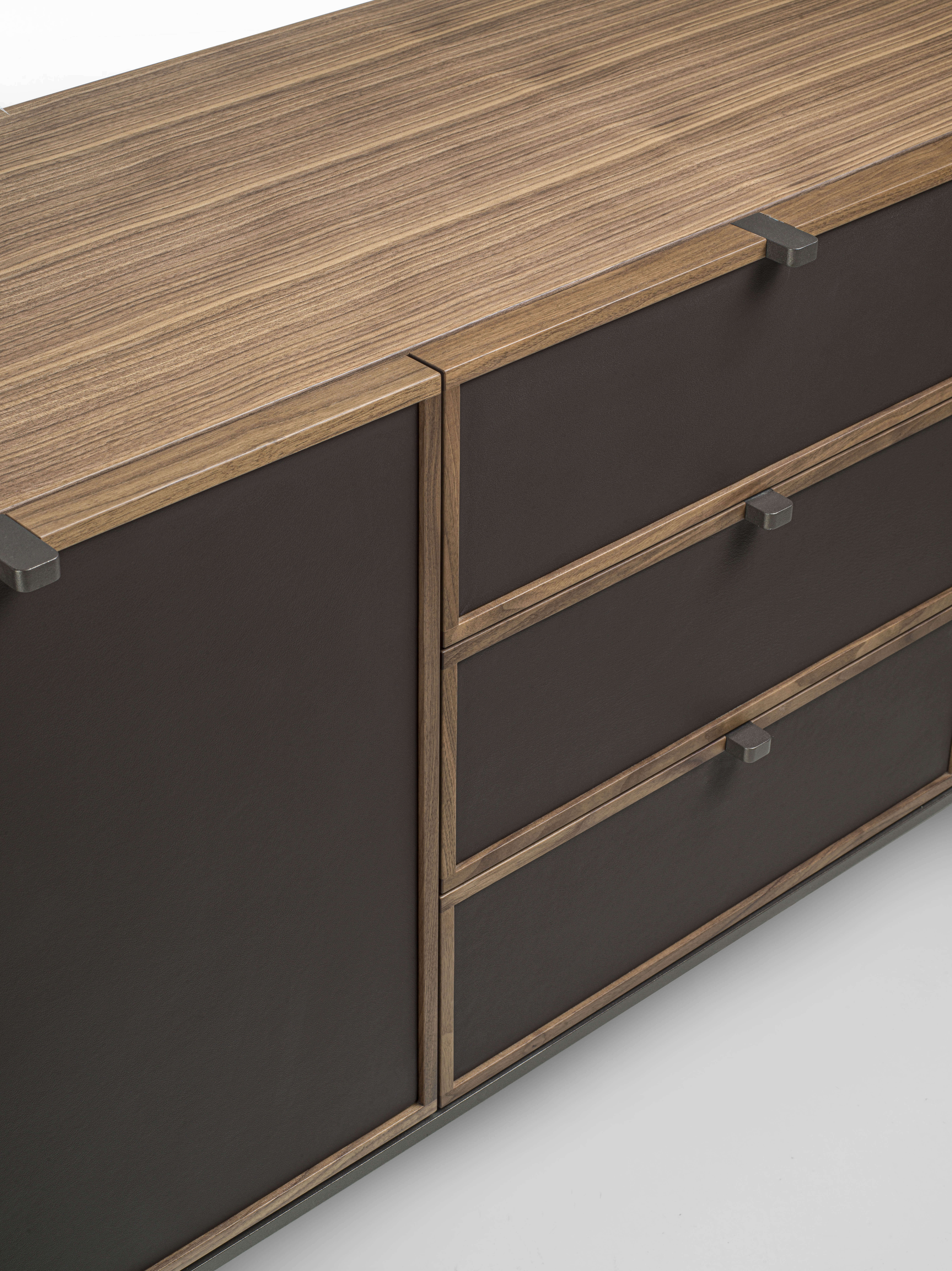 框架:實木胡桃木貼皮/實木橡木貼皮/實木黑橡木。 門:實木胡桃木貼皮/實木橡木貼皮/實木黑橡木。 抽屜:實木胡桃木貼皮/實木橡木貼皮/實木黑橡木或皮革。 桌腳:青銅色烤漆金屬/槍灰色烤漆。