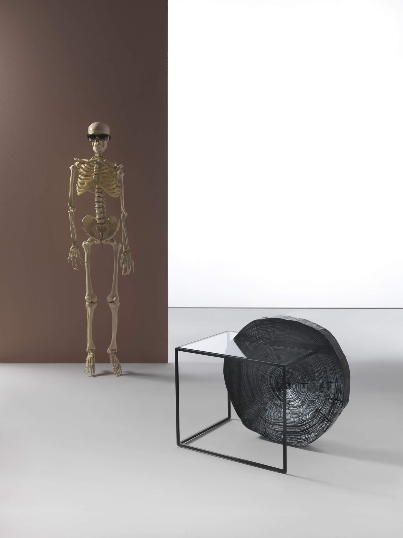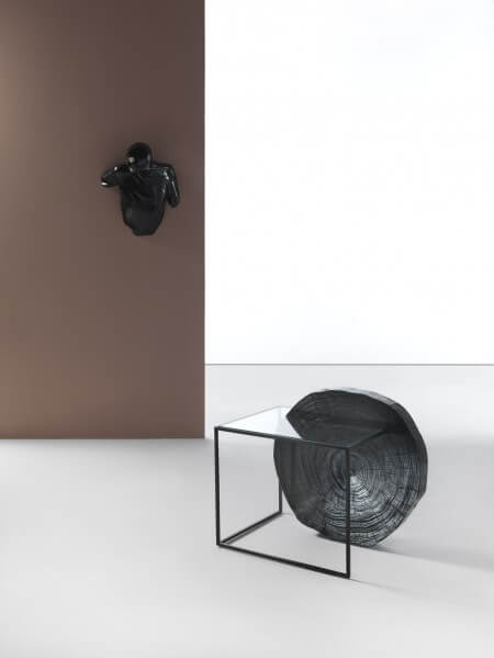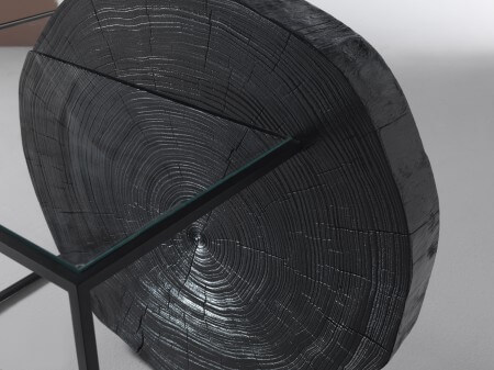 這款邊桌由塗漆金屬框架、玻璃桌面和黑色漆面雪松木樹幹部分組成。 一段木質長條支撐著金屬和玻璃構成的看似無限延伸的結構,營造出富有生命力的有機框架。